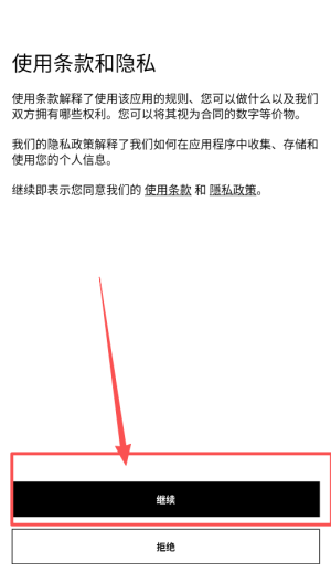 1、打開軟件后,首先閱讀使用條款與隱私政策,點(diǎn)擊底部藍(lán)色的繼續(xù)按鈕,表示同意并進(jìn)入下一步。